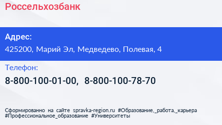 Россельхозбанк по адресу 425200, Марий Эл, Медведево, Полевая, 4 в дальнейшем Организация, размещена в следующих категориях: