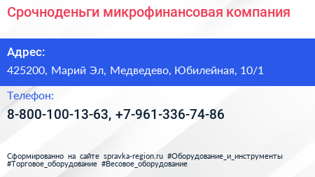 Срочноденьги, микрофинансовая компания по адресу 425200, Марий Эл, Медведево, Юбилейная, 10/1 в дальнейшем Организация, размещена в следующих категориях: