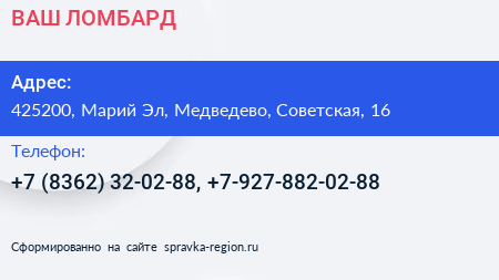 ВАШ ЛОМБАРД по адресу 425200, Марий Эл, Медведево, Советская, 16 в дальнейшем Организация, размещена в следующих категориях: