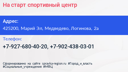 На старт, спортивный центр по адресу 425200, Марий Эл, Медведево, Логинова, 2а в дальнейшем Организация, размещена в следующих категориях: