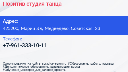 Позитив, студия танца по адресу 425200, Марий Эл, Медведево, Советская, 23 в дальнейшем Организация, размещена в следующих категориях: