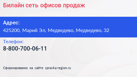 Билайн, сеть офисов продаж по адресу 425200, Марий Эл, Медведево, Медведево, 32 в дальнейшем Организация, размещена в следующих категориях: