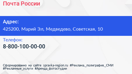 Почта России по адресу 425200, Марий Эл, Медведево, Советская, 10 в дальнейшем Организация, размещена в следующих категориях: