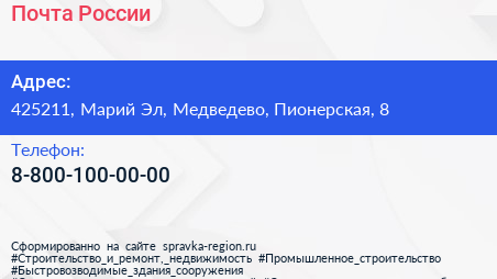Почта России по адресу 425211, Марий Эл, Медведево, Пионерская, 8 в дальнейшем Организация, размещена в следующих категориях: