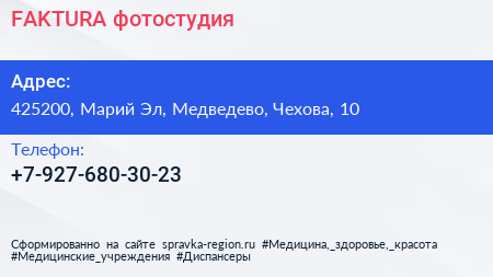 FAKTURA, фотостудия по адресу 425200, Марий Эл, Медведево, Чехова, 10 в дальнейшем Организация, размещена в следующих категориях: