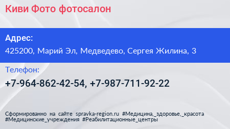 Киви Фото, фотосалон по адресу 425200, Марий Эл, Медведево, Сергея Жилина, 3 в дальнейшем Организация, размещена в следующих категориях: