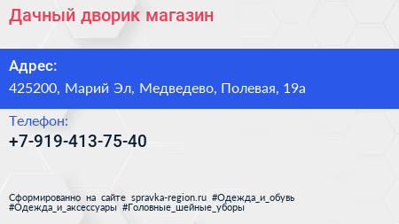 Дачный дворик, магазин по адресу 425200, Марий Эл, Медведево, Полевая, 19а в дальнейшем Организация, размещена в следующих категориях: