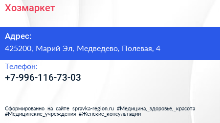 Хозмаркет по адресу 425200, Марий Эл, Медведево, Полевая, 4 в дальнейшем Организация, размещена в следующих категориях: