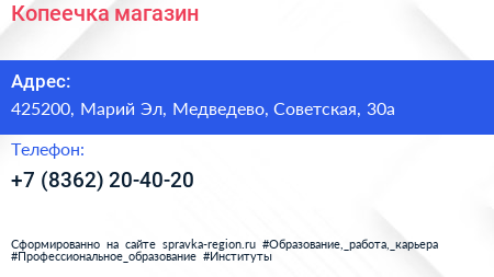 Копеечка, магазин по адресу 425200, Марий Эл, Медведево, Советская, 30а в дальнейшем Организация, размещена в следующих категориях: