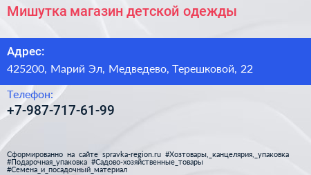 Мишутка, магазин детской одежды по адресу 425200, Марий Эл, Медведево, Терешковой, 22 в дальнейшем Организация, размещена в следующих категориях:
