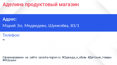 Аделина, продуктовый магазин по адресу Марий Эл, Медведево, Шумелёва, 83/1 в дальнейшем Организация, размещена в следующих категориях: