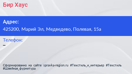 Бир Хаус по адресу 425200, Марий Эл, Медведево, Полевая, 15а в дальнейшем Организация, размещена в следующих категориях: