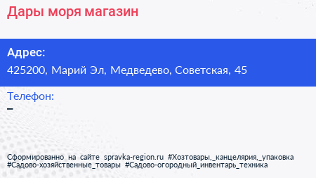 Дары моря, магазин по адресу 425200, Марий Эл, Медведево, Советская, 45 в дальнейшем Организация, размещена в следующих категориях: