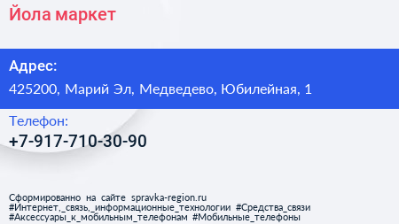 Йола-маркет по адресу 425200, Марий Эл, Медведево, Юбилейная, 1 в дальнейшем Организация, размещена в следующих категориях: