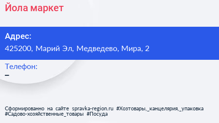 Йола-маркет по адресу 425200, Марий Эл, Медведево, Мира, 2 в дальнейшем Организация, размещена в следующих категориях: