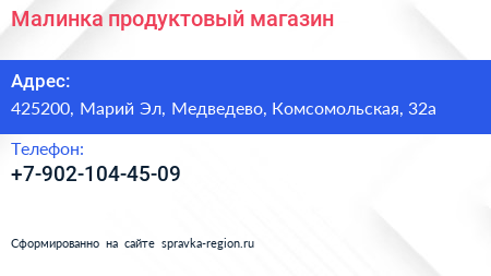 Малинка, продуктовый магазин по адресу 425200, Марий Эл, Медведево, Комсомольская, 32а в дальнейшем Организация, размещена в следующих категориях: