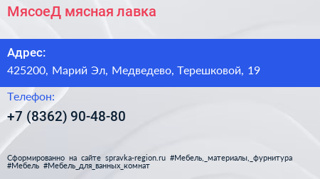 МясоеД, мясная лавка по адресу 425200, Марий Эл, Медведево, Терешковой, 19 в дальнейшем Организация, размещена в следующих категориях: