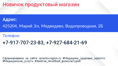 Новичок, продуктовый магазин по адресу 425204, Марий Эл, Медведево, Водопроводная, 2Б в дальнейшем Организация, размещена в следующих категориях: