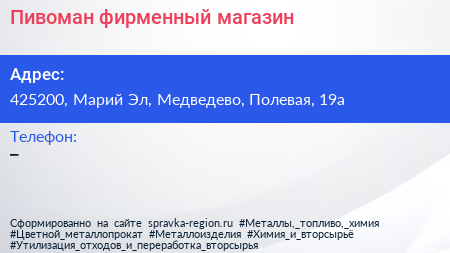 Пивоман, фирменный магазин по адресу 425200, Марий Эл, Медведево, Полевая, 19а в дальнейшем Организация, размещена в следующих категориях: