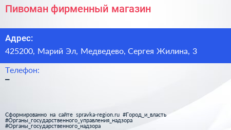 Пивоман, фирменный магазин по адресу 425200, Марий Эл, Медведево, Сергея Жилина, 3 в дальнейшем Организация, размещена в следующих категориях:
