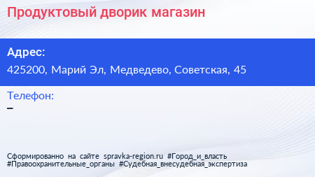 Продуктовый дворик, магазин по адресу 425200, Марий Эл, Медведево, Советская, 45 в дальнейшем Организация, размещена в следующих категориях: