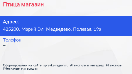 Птица, магазин по адресу 425200, Марий Эл, Медведево, Полевая, 19а в дальнейшем Организация, размещена в следующих категориях: