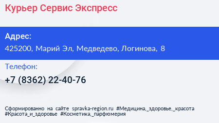 Курьер Сервис Экспресс по адресу 425200, Марий Эл, Медведево, Логинова, 8 в дальнейшем Организация, размещена в следующих категориях: