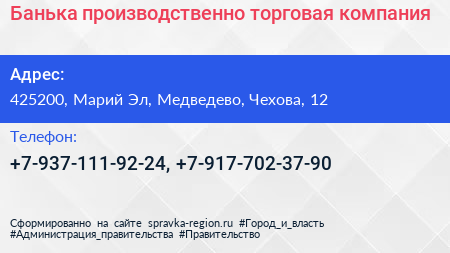 Банька, производственно-торговая компания по адресу 425200, Марий Эл, Медведево, Чехова, 12 в дальнейшем Организация, размещена в следующих категориях: