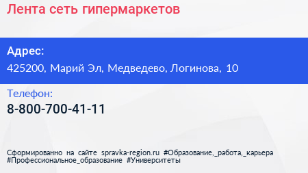 Лента, сеть гипермаркетов по адресу 425200, Марий Эл, Медведево, Логинова, 10 в дальнейшем Организация, размещена в следующих категориях: