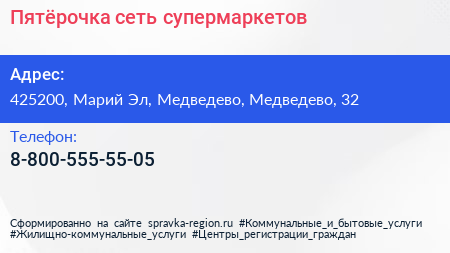 Пятёрочка, сеть супермаркетов по адресу 425200, Марий Эл, Медведево, Медведево, 32 в дальнейшем Организация, размещена в следующих категориях:
