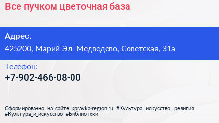 Все пучком, цветочная база по адресу 425200, Марий Эл, Медведево, Советская, 31а в дальнейшем Организация, размещена в следующих категориях: