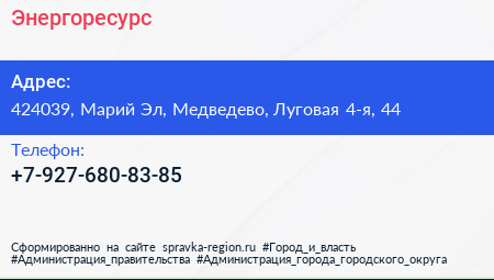 Энергоресурс по адресу 424039, Марий Эл, Медведево, Луговая 4-я, 44 в дальнейшем Организация, размещена в следующих категориях: