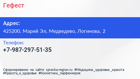 Гефест по адресу 425200, Марий Эл, Медведево, Логинова, 2 в дальнейшем Организация, размещена в следующих категориях: