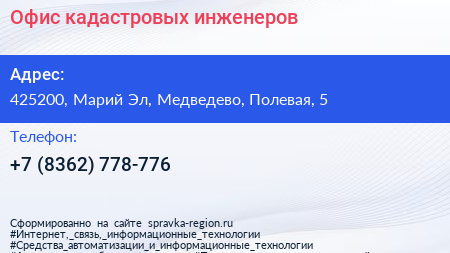 Офис кадастровых инженеров по адресу 425200, Марий Эл, Медведево, Полевая, 5 в дальнейшем Организация, размещена в следующих категориях: