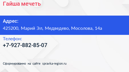 Гайша, мечеть по адресу 425200, Марий Эл, Медведево, Мосолова, 14а в дальнейшем Организация, размещена в следующих категориях: