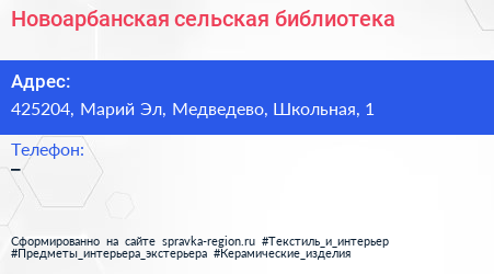 Новоарбанская сельская библиотека по адресу 425204, Марий Эл, Медведево, Школьная, 1 в дальнейшем Организация, размещена в следующих категориях:
