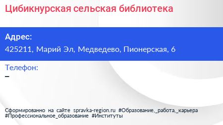 Цибикнурская сельская библиотека по адресу 425211, Марий Эл, Медведево, Пионерская, 6 в дальнейшем Организация, размещена в следующих категориях: