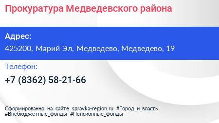Прокуратура Медведевского района по адресу 425200, Марий Эл, Медведево, Медведево, 19 в дальнейшем Организация, размещена в следующих категориях: