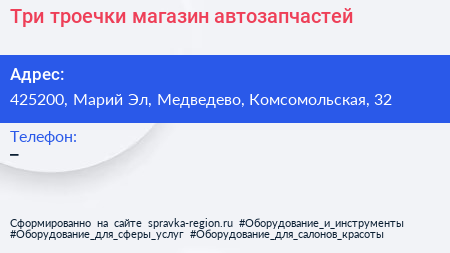 Три троечки, магазин автозапчастей по адресу 425200, Марий Эл, Медведево, Комсомольская, 32 в дальнейшем Организация, размещена в следующих категориях: