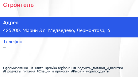 Строитель по адресу 425200, Марий Эл, Медведево, Лермонтова, 6 в дальнейшем Организация, размещена в следующих категориях:
