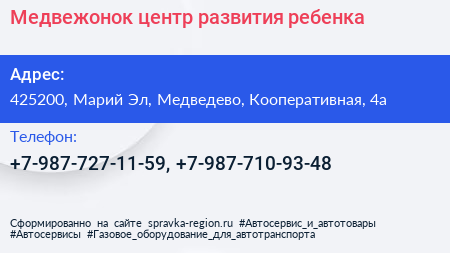 Медвежонок, центр развития ребенка по адресу 425200, Марий Эл, Медведево, Кооперативная, 4а в дальнейшем Организация, размещена в следующих категориях: