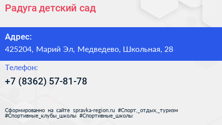 Радуга, детский сад по адресу 425204, Марий Эл, Медведево, Школьная, 28 в дальнейшем Организация, размещена в следующих категориях:
