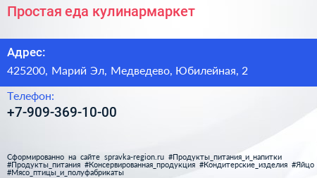 Простая еда, кулинармаркет по адресу 425200, Марий Эл, Медведево, Юбилейная, 2 в дальнейшем Организация, размещена в следующих категориях: