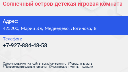 Солнечный остров, детская игровая комната по адресу 425200, Марий Эл, Медведево, Логинова, 8 в дальнейшем Организация, размещена в следующих категориях: