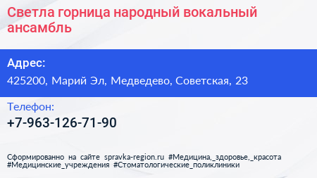 Светла горница, народный вокальный ансамбль по адресу 425200, Марий Эл, Медведево, Советская, 23 в дальнейшем Организация, размещена в следующих категориях: