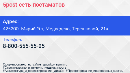 5post, сеть постаматов по адресу 425200, Марий Эл, Медведево, Терешковой, 21а в дальнейшем Организация, размещена в следующих категориях: