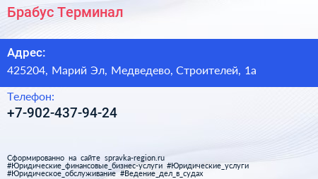 Брабус, Терминал по адресу 425204, Марий Эл, Медведево, Строителей, 1а в дальнейшем Организация, размещена в следующих категориях: