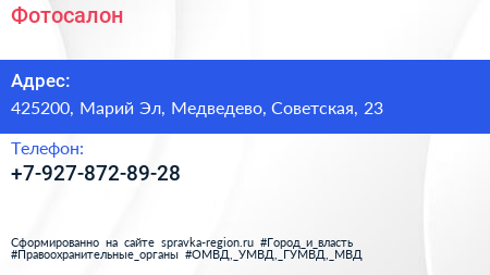 Фотосалон по адресу 425200, Марий Эл, Медведево, Советская, 23 в дальнейшем Организация, размещена в следующих категориях: