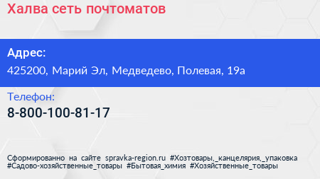 Халва, сеть почтоматов по адресу 425200, Марий Эл, Медведево, Полевая, 19а в дальнейшем Организация, размещена в следующих категориях: