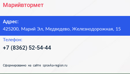 Марийвтормет по адресу 425200, Марий Эл, Медведево, Железнодорожная, 15 в дальнейшем Организация, размещена в следующих категориях: